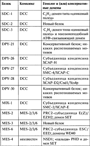 В дополнение к белкам SDC (SDC-1, SDC-2 и SDC-3) DCC содержит также набор белков DPY (DPY-21, DPY-26, DPY-27, DPY-28 и DPY-30; DPY означает dumpy) и белок MIX-1 (MIX означает «связанный с митозом и Х-хромосомой» — mitosis and X-associated) (табл. 15.1) (обзор см.: Меуег, 2005). Значительное углубление понимания механизма компенсации дозы у червей было достигнуто с открытием того, что часть DCC С. elegans похожа на 13S комплекс конденсина (табл. 15.1 и рис. 15.3) (обзор см.: Меуег, 2005). Комплекс конденсина консервативен у разных видов и играет существенную роль в правильной компактизации хромосом и их сегрегации в ходе митоза и мейоза (обзор см.: Hirano, 2002). MIX-1, DPY-27, DPY-28 и DPY-26, в частности, гомологичны существенным компонентам комплекса конденсина; MIX-1 является также существенным компонентом канонического комплекса конденсина, который действует в митозе и мейозе. Белки SDC и DPY-30 не похожи на известные субъединицы конденсина. Согласно современным взглядам, комплекс DCC был приспособлен из аниестрального комплекса конденсина для специфического «нацеливания» на гены Х-хромосомы и их даун-регуляции, вероятно, путем некоторой конденсации хроматина.