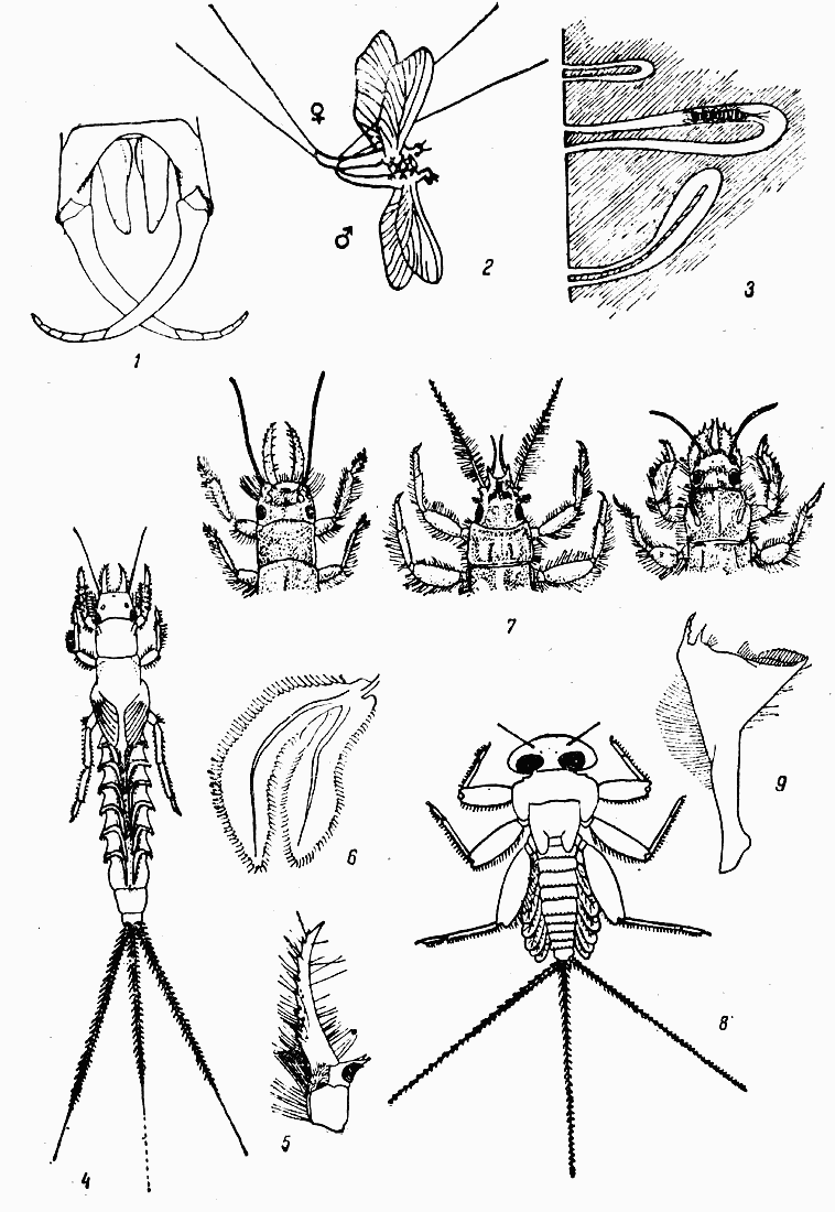 Таблица XIV: Рис. 1. Генитальные щипцы самца налингении (Palingenia longicauda). - Рис. 2. Спаривание Cloeon. - Рис. 3. Ходы личинки полимитарцис (Polymitarcys virgo). - Рис.4. Личинка полимитарцис (Polymitarcys virgo). - Puc. 5. Жвала полимитарцис. - Рис. 6. Жабра полимитарцис. - Рис. 7. Голова и грудь личинок полимитарцис (Polymitarcys virgo, слева), эфемеры (Ephemera vulgata) и палингении (Palingenia sublongicauda, справа) (по Черновой). - Рис. 8. Экдионурус (Ecdyonurus fluminum). - Рис. 9. Жвала экдионурус.