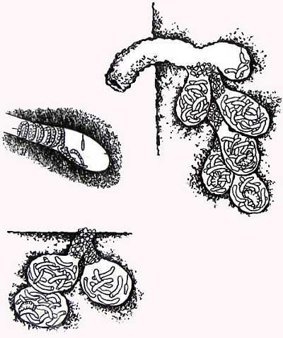 …В зале музея, отведенном для показа инженерно-архитектурных талантов веспа, бесспорно, самое видное место должно быть отведено гнездам ос Паравеснула вульгарис и германика, вырастающим нередко на месте покинутых грызунами норок. Ход в большое гнездо окружен почти сплошным кольцом земляных крупинок и более крупных камешков.