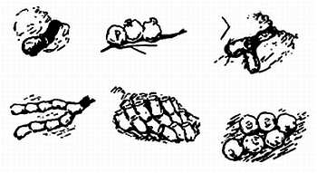 Гнезда Эумена яблоковидного. Рядом — схематические изображения гнезд еще двух эуменов. Одно, прикрепленное к дереву (А), выше — оно же в разрезе (В): а — личинка, в — перегородка, за которую чистюля-личинка складывает отбросы. Во втором, видно: подвешенное яйцо, запасенные личинки.