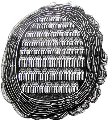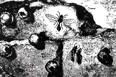 Так выглядит разрез гнезда ос в старинных книгах. Поучительно сравнить этот не лишенный достоверности, но стилизованный, можно сказать, геометризованный рисунок с изображением осиного гнезда, какое теперь печатается во всех учебниках (см. рисунок ниже).
