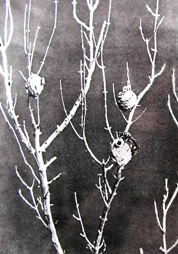 Гнезда Эумена тонкого; из нижней ячеи оса уже вывелась. Снимок сделан после удаления листвы с веток.
