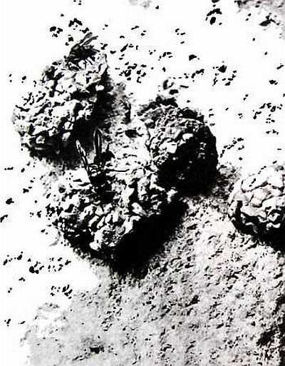 Под летком же, который служит ходом в подземное обиталище, среди сползших на дно полости камней, в мусоре, выпавшем из гнезда, густо, щеткой торчат личинки мухи-пегомии — местные санитары. Они питаются отходами жизни осограда, а также всякой всячиной, оброненной на пороге дома вернувшимися из полета фуражирами.
