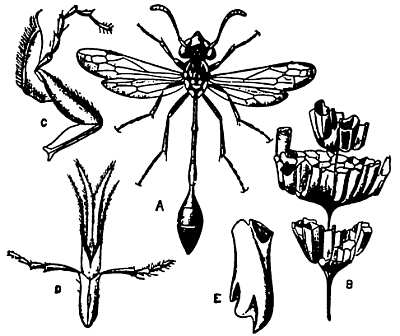 А — самка, натуральный ее размер около сантиметра; В — гнездо; С — верхняя челюсть; D — нижняя губа; E — нижняя челюсть (верхушкой книзу). Об особенностях гнезда этого насекомого смотри подробнее ниже.