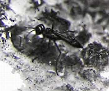 Такие норки у фотографии на соседней странице, сооружает и Анцистроцерус спиннипес — гнездо у него ветвистое. Гнездо Одинера рениформис состоит из одной норки; в нем подвешенное к своду яйцо и парализованные гусенички, оставленные матерь-осой как корм для потомства.