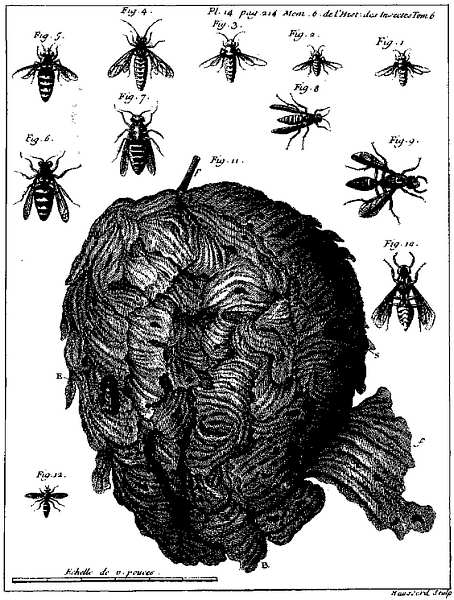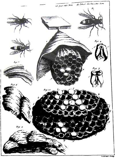 Фотокопия еще одной таблицы, приложенной к 6-му тому «Мемуаров» Реомюра. Таблица посвящена шершню, показаны все три формы — самка, самец и рабочая особь: начаток гнезда, сот с открытыми, запечатанными и распечатанными ячейками, обрывки гнездовой оболочки.