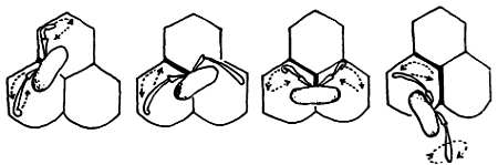 Но уже до этого (что подает для начала такой работы команду?) от центра второго сота начинает опускаться вниз ножка следующего крепежного столбика, на конце его вырастают первые ячеи следующего этажа — третьего. Отсюда вскоре отходит вниз столбик, который обрастает четвертым сотом. Ленты и столбики выполняются из самого крепкого материала, куда более прочного, чем ячеи или оболочка. Каждый новый сот вырастает вокруг трех-четырех мисочек-начатков, которые увеличиваются в высоту и становятся шестигранными.
