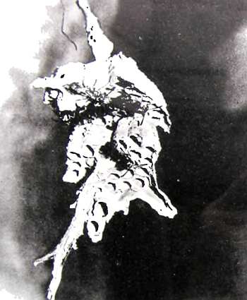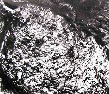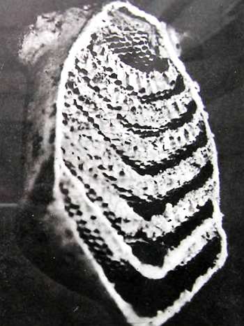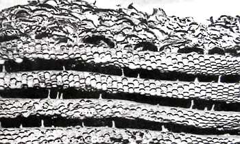 То же гнездо, что на предыдущем снимке. Разрез открывает взору семь слоев сотой, но не прямых, как обычно, а ясно изогнутых углом. Именно в вершине угла и оставляются проходы, по которым осы могут провираться в верхние, более старые, соты и, наоборот, спускаться вниз к летку.