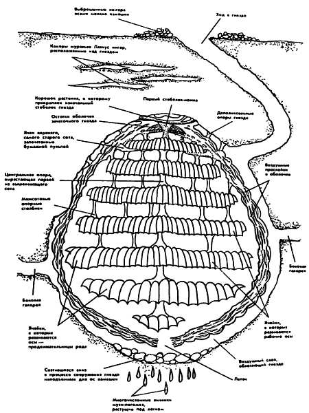 Высотой иногда до полуметра яйцевидные сооружения висят в земле тупым концом кверху и уже не одним стебельком, а несколькими связками припаяны к несущим весь груз частям корневого побега и к гладкому земляному своду полости. Сплошная толстая, хоти и рыхлая скорлупа в зрелых гнездах заполнена горизонтальными в шесть-семь-восемь параллельных рядов сотами, а расположено гнездо часто на глубине метра от поверхности…