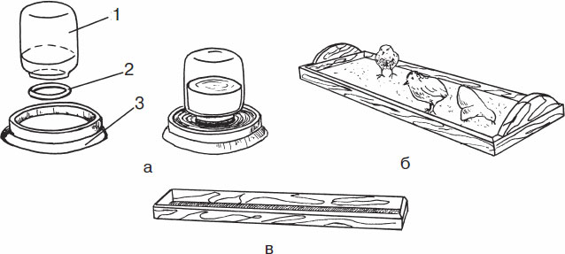 Рисунок 13. Оборудование для кормления перепелят: а) поилка вакуумного типа (1 – емкость для воды; 2 – подставка; 3 – миска); б) кормушка-противень; в) кормушка желобковая