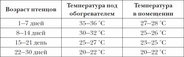 Для сохранения потомства очень важно соблюдать температурный и световой режимы, регулировать влажность воздуха. Особое внимание в первый месяц жизни молодняка следует уделять поддержанию постоянной температуры, поскольку малейшее охлаждение может привести к гибели птенцов (см. таблицу ниже).
