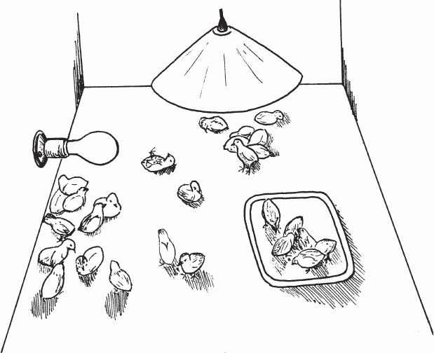 Как вариант, возможно объединение двух частей клетки – для обогрева и непосредственно для птенцов. В этом случае одновременно решаются две проблемы – освещения и обогрева. Лампу подвешивают на высоте 10 см от пола (рис. 14).