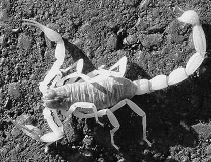 Так, в Закавказье, Средней Азии и Нижнем Поволжье нередко можно увидеть небольшого (всего 6,5 мм в длину) пестрого скорпиона, отличающегося от других желто-бурой окраской с темными пятнами и продольными полосами на спине.
