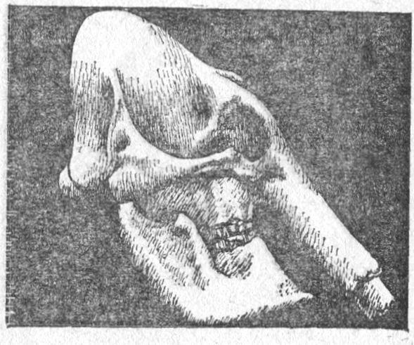 С точки зрения проблемы вымирания значительный интерес представляет вся история ветви мамонтов. Древний род архидискодонов, широко распространенный в самом конце третичного периода, имел относительно невысокие коренные зубы, состоящие у его типичного представителя, южного слона (рис. 25), из небольшого числа пластин и характеризовавшиеся их малой частотой. Однако уже в начале четвертичного периода отщепились от этой первоначальной линии развития архидискодонов формы, обладавшие большим числом пластин на молярах и более высокой коронкой, чем у южного слона. Эти формы, относимые уже к роду мамонтов, принадлежат к так называемому трогонтериевому слону (рис. 26), несомненно, тесно связанному экологически с южным слоном. Обладая явно более совершенным строением зубного аппарата, трогонтерневый слон