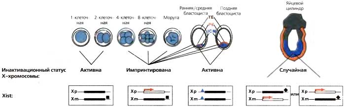 Рисунок иллюстрирует современные знания и модели импринтированной и случайной регуляции Xist у ранних мышиных эмбрионов XX. Аллель Xm гена Xist приходит в зиготу с репрессивным импринтом, возможно опосредованным антисмысловым локусом Tsix (черный квадратик). Аллель Хр готова к тому, чтобы быть активной, и экспрессируется как только на 2-клеточной стадии происходит активация эмбрионального гена. Со стадии 2 клеток до стадии морулы Хр Xist экспрессируется во всех клетках (экспрессия показана открытым прямоугольником и стрелкой на 5’-конце). Этот паттерн поддерживается на стадии ранней бластоцисты и впоследствии в клетках ТЕ и РЕ и производных от них полностью дифференцированных тканей. В ICM поздней бластоцисты экспрессия Xist прекращается, возможно с помощью ICM-специфичного репрессорного фактора (голубой треугольник). Впоследствии экспрессия Xist начинается во время гаструляции. Здесь блокирующий фактор (черный ромб) гарантирует, чтобы экспрессия Xist не могла происходить на одной из двух аллелей (счет)