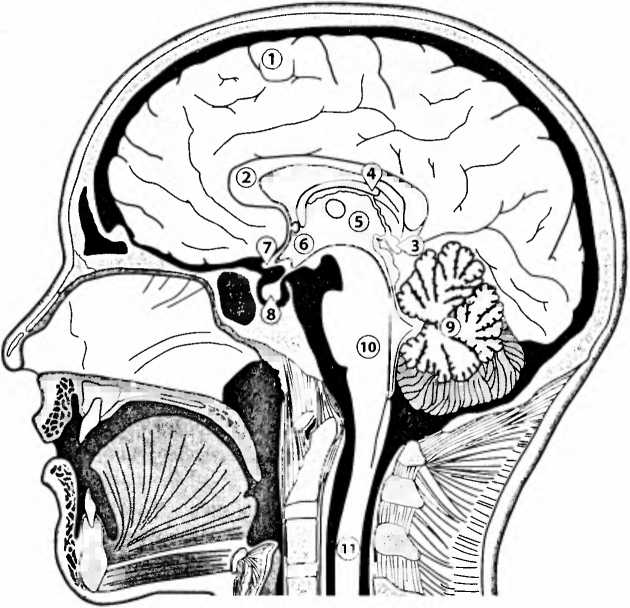 Рис. 2. Схематическое изображение головного мозга, продольный разрез: 1) кора больших полушарий (cortex) с извилинами большого мозга (cerebrum); 2) мозолистое тело (corpus callosum), соединение между левым и правым полушариями; 3) эпифиз (шишковидная железа, ночью вырабатывает гормон сна мелатонин, задерживающий у детей насгупление половой зрелости); 4) fornix (свод конечного мозга, транспортирует информацию памяти из гиппокампа в corpus mamillare, сосцевидное тело в задней части гипоталамуса, см. рис. 25), из памяти информация затем следует дальше к таламусу и коре больших полушарий; 5) таламус, сюда информация поступает от органов чувств и памяти; 6) гипоталамус, имеет решающее значение для выживания индивидуума и всего вида; 7) пересечение зрительных нервов (оптическая хиазма); 8) гипофиз; 9) мозжечок (cerebellum); 10) ствол мозга; 11) спинной мозг.