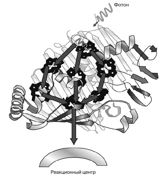 Пока все идет хорошо: сейчас мы имеем источник свободных электронов благодаря энергии, доставленной экситонами в хлорофилл. Далее растение должно послать эти электроны туда, где они будут использованы в работе. Сначала они захватываются описанным переносчиком электронов, НАДФН. Мы уже встречали похожую молекулу, НАДН, в предыдущей главе, где она участвовала в переносе электронов, захваченных от питательных веществ, таких как сахара, к дыхательной цепи ферментов в энергетических клеточных органеллах, митохондриях. Если помните, захваченные электроны, доставленные к митохондриям переносчиком НАДН, затем идут по дыхательной цепи ферментов как своего рода электрический ток, который используется для переноса протонов через мембрану, а обратный поток этих протонов используется для получения клеточного энергоносителя, АТФ. Очень похожий процесс используется для получения АТФ в хлоропластах растений. НАДФН захватывает электрон и переносит его к цепи ферментов, которые подобным образом выносят протоны через мембрану хлоропласта. Обратный поток этих протонов используется для получения молекул АТФ, которые впоследствии могут обеспечивать энергией многие энергозатратные процессы в растительной клетке.