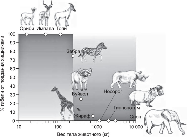 В случае с большинством биологических видов в природе сформулировать этот вопрос гораздо проще, чем ответить на него. Требуются долгосрочные наблюдения, а еще лучше – эксперименты. Синклер и его коллеги Саймон Мдума и Джастин Брейшерз исследовали 40-летний массив данных о причинах смертности среди млекопитающих в Серенгети. Они обнаружили сильнейшую корреляцию между размером тела и уязвимостью для хищников.