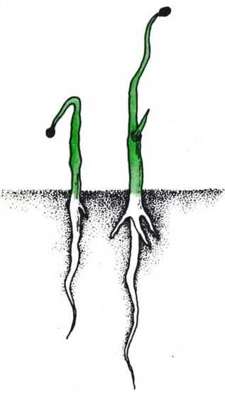 Всходы лука. На поверхность почвы у него выходит длинная трубчатая семядоля часто с черной семенной кожурой на верхушке. Из поры в нижней части семядоли выходит первый настоящий лист.