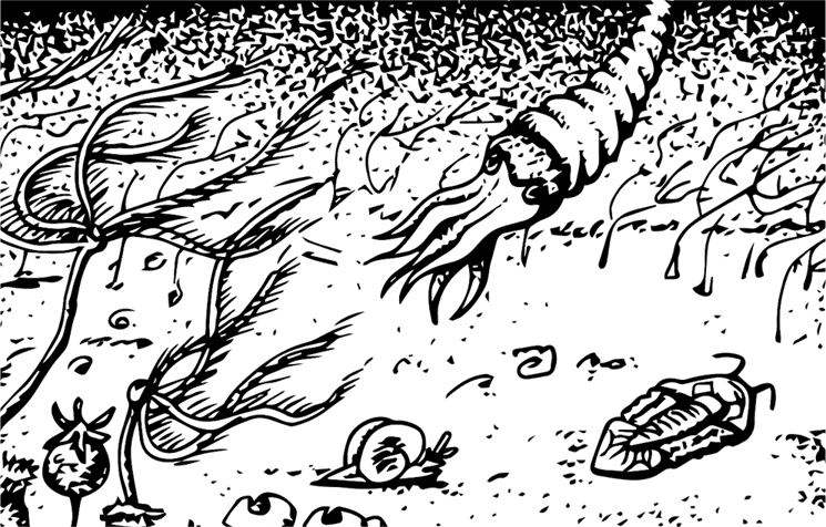 Среди настоящих членистоногих продолжали развиваться некоторые экзотические группы. Самая известная позднеордовикская Marrellomorpha – Furca bohemica – чудное существо, похожее не то на мчащуюся морскую звезду с шестью полощущимися на ветру мохнатыми лучами, не то на наскальный рисунок вислорогого снежного человека. Как ни странно, членистых ног, на сохранившихся отпечатках, вообще не видно. Вероятно, они были полностью спрятаны под шестилучевым панцирем или вовсе атрофировались.