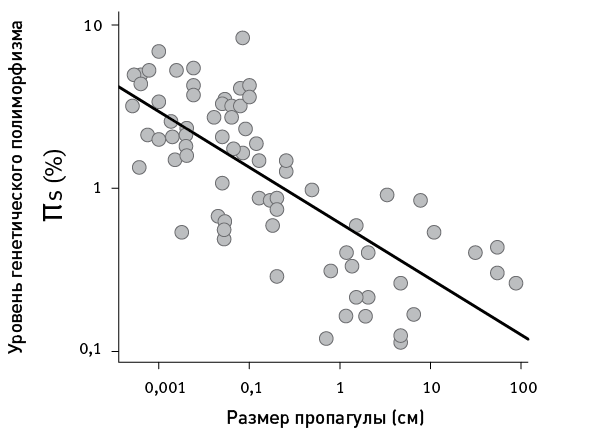 рис. 19.1. Размер пропагулы коррелирует с уровнем генетического полиморфизма (?s). По рисунку из Romiguier et al., 2014.