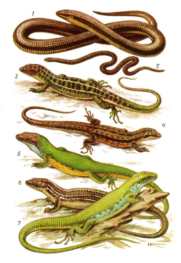 Ящерицы: 1 — желтопузик; 2 — веретеница; 3 — прыткая (самец); 4 — живородящая; 5 — зеленая (самец); 6, 7 — средняя (соответственно самка и самец)