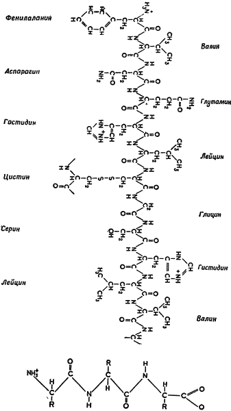 Выше изображена часть одной из двух пептидных цепей, которые образуют молекулу инсулина. Полипептидный скелет повторяется по центру цепи, образованной связанными аминокислотами и их различными боковыми цепями. Ниже изображен пептид, содержащий три аминокислоты, R — боковые аминокислотные цепи.