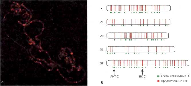 (а) Иммуноокрашивание политенных хромосом Drosophila для визуализации распределения белка РС. (б) Выравнивание хромосомных плечей, показывающее перекрывание между предсказанными сайтами PRE в геноме Drosophila и цитологически картированными сайтами связывания РС на политенных хромосомах. Два кластера генов НОХ (ANT-C и ВХ-С) являются особо заметными сайтами для PRCls