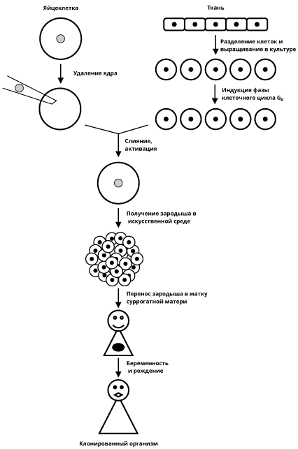 Рис. 41. Общая схема процедуры клонирования любых животных организмов (включая человека) с помощью пересадки ядер взрослых соматических клеток в женскую половую клетку (яйцеклетку)