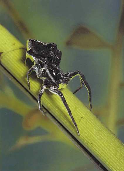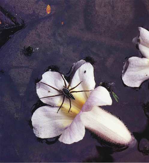 Этот пизаурид-шеститочечник пользуется опавшим цветком как средством передвижения. Отсутствие прямого соприкосновения с водой не мешает ему улавливать колебания, вызванные тонущими насекомыми.