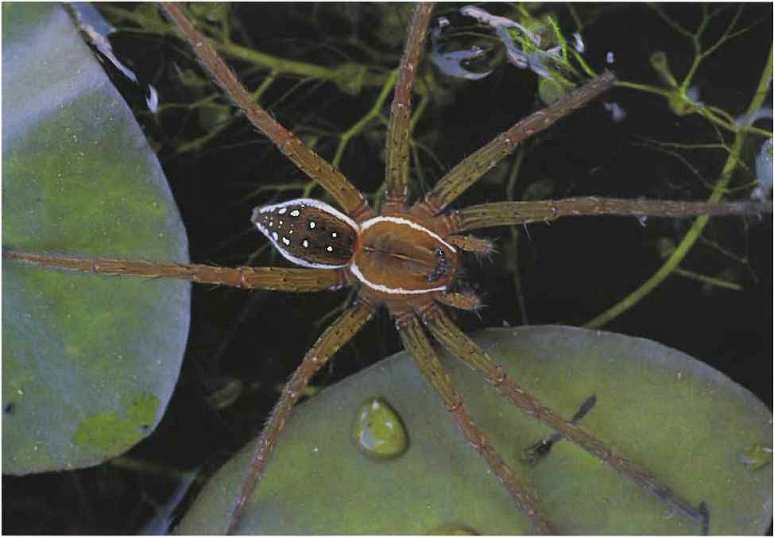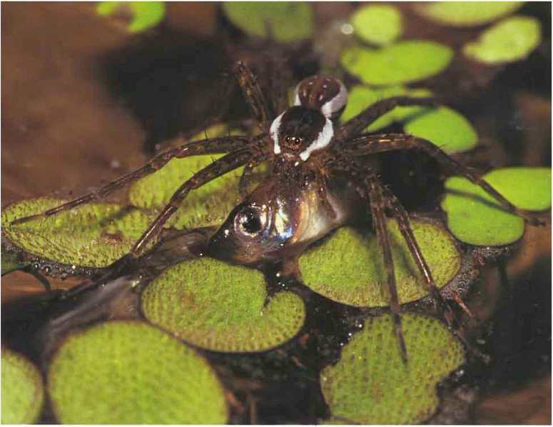 Полностью оправдывая свое имя, паук-рыбак, или пизаурид-шеститочечник (Dolomedes triton), только что поймал гольяна, которому не стоило плавать так близко к поверхности воды.