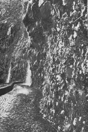 Фото 87. Дорога, соединяющая города Сан-Висенти и Портодо-Мониц (остров Мадейра), почти на всем протяжении окружена отвесными скалами. На лишенных почвы, но хорошо увлажненных благодаря сочащимся родникам каменных стенах обитает плотное сообщество мхов, эндемичных аэоний и различных трав.