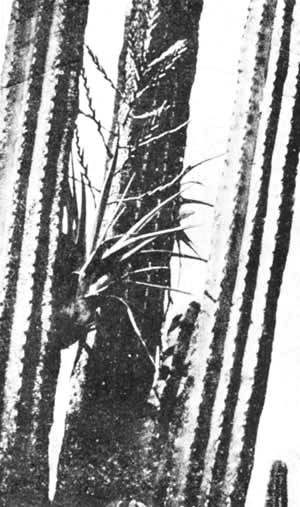 Фото 89. Проросшая на совершенно гладкой поверхности гигантского колоннообразного кактуса Tillandsia dasylirifolia превратилась за несколько лет в крупное цветущее растение. Все это возникло как бы из ничего, ибо растение-хозяин не снабжает тилландсию питательными веществами — они поступают прямо из воздуха.
