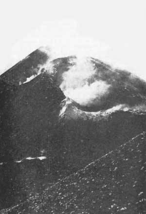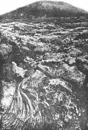 Не менее сурова жизнь у растений, обитающих на краях кратера, непосредственно не подверженных воздействию вулканических газов или подземного тепла. Лежащий здесь сухой стерильный вулканический пепел, а тем более неровная поверхность затвердевшей лавовой корки, — далеко не идеальная почва. Однако и здесь образуются скромные растительные сообщества из толстянковых, верблюжьей колючки и лишайников (фото 92 и 93).