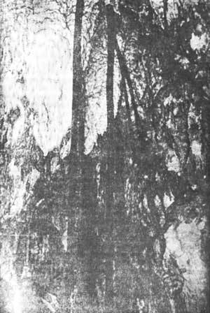 Я побывал в 50 пещерах и при этом дважды сталкивался с ботаническим курьезом. О нем мне хотелось бы упомянуть в книге о возможностях приспособления растений, даже если речь пойдет не о типичном явлении и даже не о растениях — аборигенах пещер. В пещеру, расположенную в окрестностях города Бар в Швейцарии, известную богатством и разнообразием форм сталагмитов и сталактитов, а также в пещеру Пеш-Мерле в окрестностях французского городка Кабрера (департамент Ло), в которой обнаружены следы обитания доисторического человека, непонятно каким образом проникли корни явора. Абсолютная темнота и высокая влажность воздуха создали как будто идеальные условия для их роста. Однако новое окружение оказалось и несколько необычным: отсутствовала почва. И корни «нашли оригинальное решение»: они не ветвились, как это происходит в нормальных условиях, а равномерно росли в направлении дна пещеры (высота пещер достигала 6 метров), стремясь достичь привычного слоя почвы (фото 96).