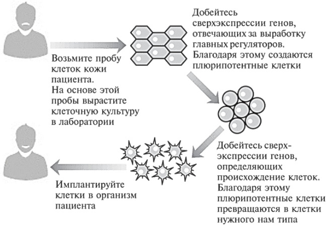 До развития этой новой технологии ученые испытывали огромные трудности при создании нужных клеток для лечения тех или иных болезней человека. Дело в том, что клетки, взятые у одного человека, обычно не удается спокойно имплантировать другому. Иммунная система распознает донорские клетки как чужеродные и уничтожает их, как если бы они являлись организмом-захватчиком. Однако, как показано на рис. 12.1, теперь мы в принципе имеем возможность производить клетки, идеально подходящие конкретному пациенту.
