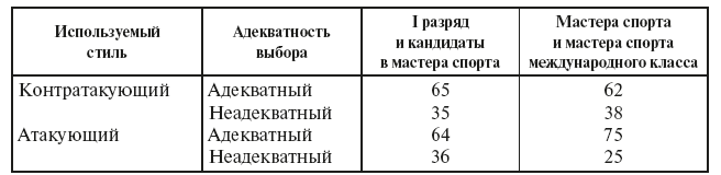 Как оказалось, в группах спортсменов атакующего или контратакующего стиля насчитывается примерно 2/3 спортсменов, адекватно выбравших стиль соревновательной деятельности, соответствующий их врожденным индивидуально-типологическим особенностям, и около 1/3 спортсменов с неадекватным выбором, которые, по-видимому, компенсируют этот выбор другими функциональными возможностями организма (табл. 15).
