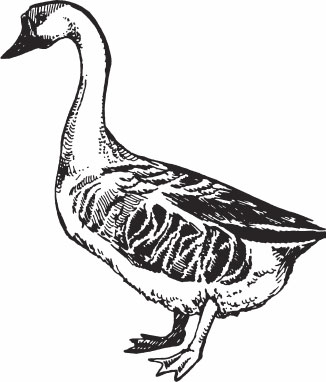 Существует две разновидности окраски китайских гусей: белые и бурые. Туловище яйцевидной формы, спереди приподнятое, стройное, средней длины. Голова длинная, вытянутая, широкая, шея очень длинная, резко изогнута. На лбу у основания клюва есть большая шишка. Грудь округлая. Хвост немного приподнят вверх, перья на хвосте плотные. Ноги и клюв оранжевого цвета (рис. 16).