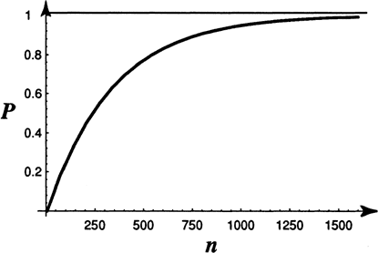 Рис. 36. Зависимость вероятности образования заузленной молекулы от числа сегментов в ней n. Кривая получена в результате расчетов на компьютерах