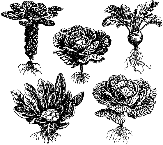 Нужно было в течение многих веков возделывать такую капусту на хорошо удобренной, влажной почве в низинах у рек и озер; нужно было часто поливать ее, чтобы получить большие и нежные листья; нужно было отбирать растения с крупными завивающимися в кочан листьями, — в результате в наше время мы имеем множество сортов капусты, различных по форме и цвету и созревающих в разное время.