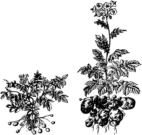 Перезимует такой клубень у дикого картофеля в почве, у культурного в подвале, а весною под действием тепла и влаги прорастут его почки и дадут новое растение картофеля. Эти толстенькие стебли, которыми размножается картофель, мы и употребляем в пищу.