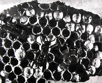 Обломок сота. На нем можно рассмотреть трех взрослых ос, а справа внизу на снимке ячейку со взрезанной изнутри крышечкой.