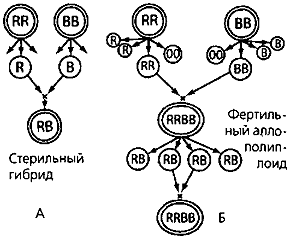 Мировую известность приобрели эксперименты Г. Д. Карпеченко по синтезу межродового гибрида между редькой (Raphanus sativus) и капустой (Brassica oleracea), опубликованные в 1924–1927 гг. и описанные затем в огромном количестве книг, как отечественных, так и зарубежных (рис. 10). Цитологический анализ полученного плодовитого гибрида, названного рафанобрассикой, показал, что он имел в своем хромосомном наборе сумму диплоидных наборов родительских форм (2n = 18), т. е. был тетраплоидом. Тем самым впервые в истории была преодолена гибридная стерильность, неизменно возникающая вследствие нарушения конъюгации хромосом в мейозе из-за не гомологичности хромосом гаплоидных гамет. В данном же успешном эксперименте Карпеченко имел дело с нередуцированными диплоидными гаметами.