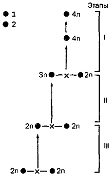 На первом этапе в результате гибридизации на уровне бисексуальных нарождающихся диплоидных видов может образоваться диплоидная форма, переходящая к клональному размножению путем гиногенеза (рыбы), «одалживания» отцовского генома на одно поколение (рыбы, бесхвостые амфибии) или партеногенеза (хвостатые амфибии, рептилии). На втором этапе вледствие возвратной гибридизации этой диплоидной однополой формы с одним из родительских видов может возникнуть триплоидная однополая форма, размножающая с помощью гино- или партеногенеза. Наконец, на третьем этапе в результате скрещивания этой последней с одним из близких бисексуальных диплоидных видов может появиться тетраплоидная форма, способная вернуться к нормальному бисексуальному размножению (рис. 11).
