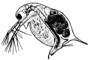 Ветвистоусый рачок Daphnia longispina — массовый представитель зоопланктона озер и луж умеренной зоны. На фотографии видны зреющие яйца в выводковой камере.
