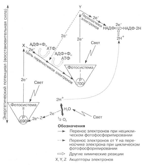 Известны два типа фотосинтетических систем, содержащих хлорофилл. Фотосинтетическая система I (ФС I) состоит из разновидности хлорофилла 700, а фотосинтетическая система II (ФС II) — из разновидности хлорофилла 690. Каждая из фотосистем способна поглощать кванты света и испускать возбужденные электроны, которые попадают на электронно-транспортную цепь ферментов, расположенных на мембране тилакоидов. Эти процессы протекают синхронно (рис. 12).
