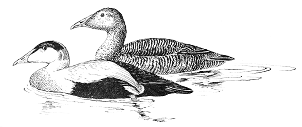 Гага обыкновенная — одна из самых крупных уток. Масса ее тела составляет 2–2,5 кг. У самца пестрое оперение: верх его белый, темя черное, затылок зеленый, грудь оранжево-розовая, брюхо черное. Самка рыжевато-бурая с темными пестринами.