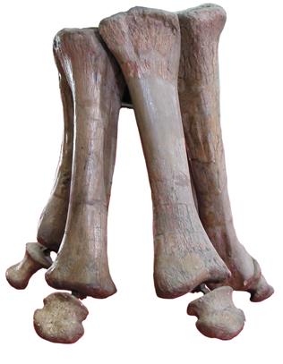 Передние конечности завропод уникальны. Часто на них не было ни когтей, ни копыт, а пястные кости – кости, которые образуют ладонь, – формировали нечто вроде трубы или колоннады. На фото: передняя конечность африканского брахиозавра жираффатитана