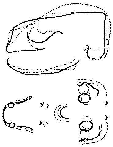 Рис. 9. Еще три выравненных по длине черепа (сплошная линия — морской кот, прерывистая линия — молодой ленивец, пунктир — медведь)
