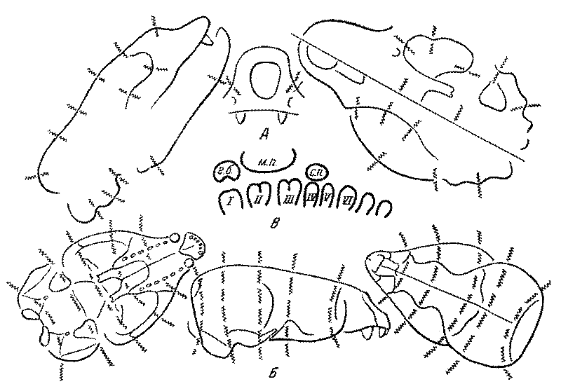 A — четыре проекции схематизированного черепа ушастого тюленя (слева — вид сбоку, посредине — вид спереди, справа — половина вида сверху и половина вида снизу) с указанием (зигзагообразными линиями) мест пересечения индивидуальных контуров друг с другом при наложении, что обозначает границы блоков независимых изменений. Б — три проекции черепа молодого морского кота с еще не заросшими межкостными швами, что позволяет соотнести топографию межкостных швов (сплошные линии) с топографией полученных первым способом границ блоков независимой изменчивости (зигзагообразные линии). В — эмбриональная метамерия головы млекопитающего (из работы Б. С. Матвеева, 1923) с указанием положения глазного бокала (г. б.), мозгового пузыря (м. п.), слухового пузырька (с. п.) и пронумерованных метамеров, позволяющих соотнести детали эмбриональных и взрослых конструкций